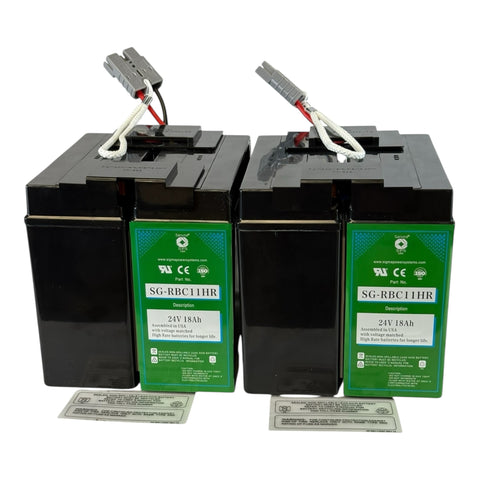 Part no SG-RBC11HR (Rechargeable battery Cartridge) compatible with battery cartridge used in OEM, 24V18Ah battery Cartridge. This high rate battery cartridge provides higher current for short perio compared to general 18Ah from the OEM. Two high rate12V18Ah batteries connected in series with fuse. Each SU1400RMXLNET High rate battery cartridge is assembled with fresh voltage matched batteries for longer life. This battery cartridge is built with fresh batteries from the same manufacturing lot for longer life.