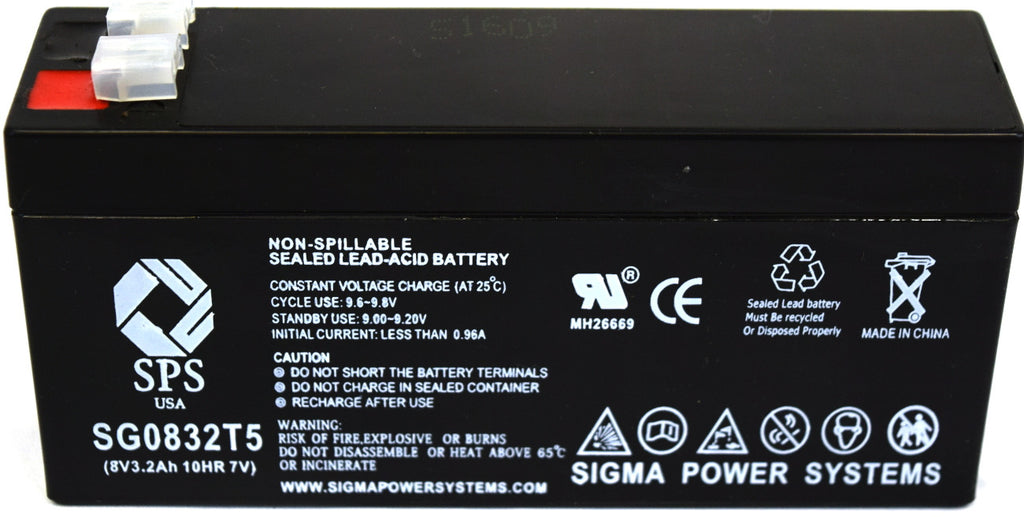 Any Battery 4714 battery provided is a 8V 3.2Ah rechargeable SLA type with AGM technology. Each battery has a dimension of 1.44 x 5.28 x 2.71 inches. Any Battery 4714 supplied by Sigma Batteries is manufactured by Sigma Power Systems with the part number SG0832T5. Any Battery 4714 has T1 terminals with a dimension of 0.187 inches.